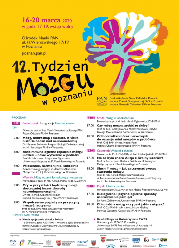 Polska Akademia Nauk Oddział w Poznaniu zaprasza na 12. Tydzień Mózgu w Poznaniu, który odbędzie się w dniach 16-20 marca 2020 r. w godz. 17.00-19.00.