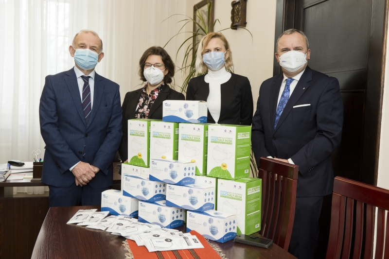 Pan Janusz Szulik Prezes Zarządu INTER Polska i Pani Beata Raczak Dyrektor Oddziału Poznań na spotkaniu w dniu 2 grudnia br. przekazali maski ochronne Prorektorowi ds. Studenckich prof. dr. hab. Edmundowi Grześkowiakowi oraz Przewodniczącej RUSS Martynie Piszczek.