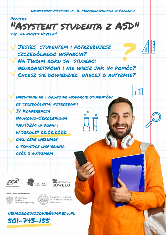 Projekt „Asystent studenta z ASD” na Uniwersytecie Medycznym w Poznaniu współfinansowany jest przez Unię Europejską w ramach Europejskiego Funduszu Społecznego, w ramach IV Osi Priorytetowej Programu Operacyjnego Wiedza Edukacja Rozwój 2014-2020 „Innowacje społeczne i współpraca ponadnarodowa”.