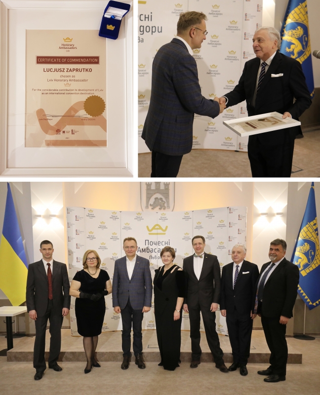 I to właśnie ten Wydział najintensywniej rozwinął różne formy wspólnych działań, począwszy od licznych współautorskich badań naukowych, poprzez szeroką wymianę stażystów, doktorantów, stypendystów i grup studenckich, po organizację wspólnych konferencji, wykładów gościnnych i zajęć dla studentów. Wszystkim tym działaniom zawsze towarzyszy szeroka wzajemna promocja naszych Uczelni i naszych miast. I to właśnie za tę wieloletnią aktywność i zaangażowanie we wszelkie działania wspierające i promujące Lwów oraz tamtejszy Uniwersytet Medyczny, profesor Zaprutko został wyróżniony tytułem Honorowego Ambasadora Lwowa. Ten zaszczytny tytuł odebrał osobiście z rąk Prezydenta tego miasta podczas specjalnej Gali w lwowskim Ratuszu, w dniu 17 grudnia br. Dyplomowi i odznace Ambasadorskiej towarzyszy czek na 25.000 hrywien, z możliwością wykorzystania go na współorganizację dowolnej konferencji naukowej we Lwowie. Oczywiście, plany w tym zakresie już się zrodziły i należy oczekiwać w najbliższym roku pojawienia się w kalendarzu imprez „Prekolokwium farmaceutycznego” poprzedzającego większą tego typu konferencję zaplanowaną na rok 2023. Ów tytuł ambasadorski zapewne przyczyni się do jeszcze większej aktywizacji istniejącej współpracy obu ośrodków i pomoże w realizacji kolejnych wspólnych ambitnych planów naukowych.