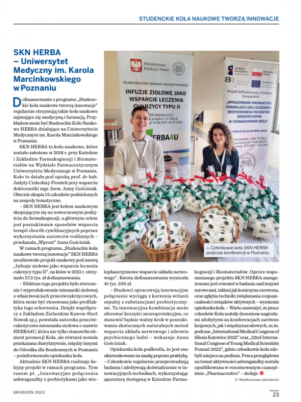 Na łamach czasopisma zostały opisane sukcesy studenckich kół naukowych, w tym działalność naszych studentów w ramach projektu "Studenckie Koła Naukowe Tworzą Innowacje". Studenci SKN Herba opracowali mieszanki ziołowe o działaniu przeciwcukrzycowym, które zostały skomercjalizowanie i aktualnie są stosowane jako działanie profilaktyczne przez osoby z grupy ryzyka rozwoju cukrzycy typu 2.