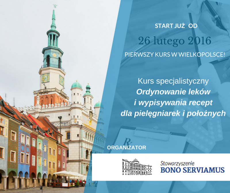 Stowarzyszenie Bono Serviamus działające na rzecz rozwoju Szpitala Klinicznego Przemienienia Pańskiego Uniwersytetu Medycznego im. Karola Marcinkowskiego w Poznaniu prowadzi rekrutację na pierwszą edycję kursu specjalistycznego "Ordynowanie leków i wypisywanie recept dla pielęgniarek i położnych". Jest to zarazem pierwszy tego typu kurs w Wielkopolsce.