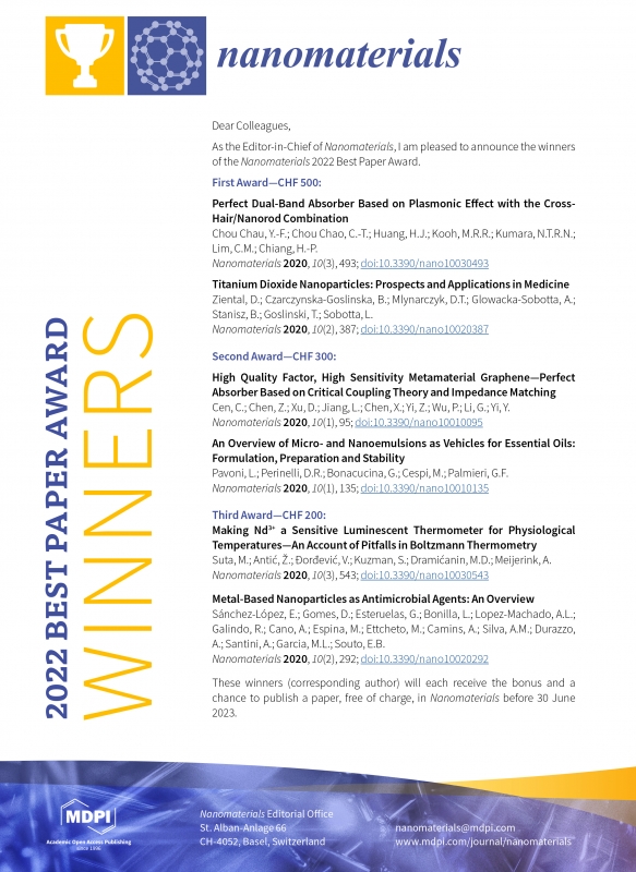 Z satysfakcją informujemy, że artykuł "Titanium Dioxide Nanoparticles: Prospects and Applications in Medicine" Ziental, D.; Czarczynska-Goslinska, B.; Mlynarczyk, D.T.; Glowacka-Sobotta, A.; Stanisz, B.; Goslinski, T.; Sobotta, L. Nanomaterials 2020, 10(2), 387; doi:10.3390/nano10020387 otrzymał nagrodę Best Paper Award 2022, przyznaną przez czasopismo Nanomaterials (Basel). Nagrodzony artykuł był najczęściej cytowanym przeglądem czasopisma z ostatnich trzech lat, odnotowując 163 cytowania.