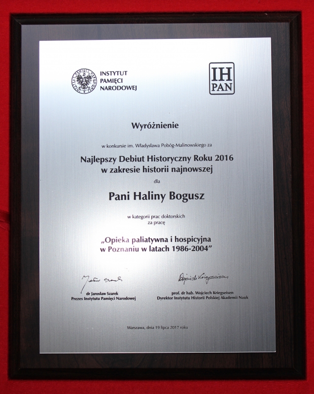 Z satysfakcją informujemy, że dr med. Halina Bogusz z Katedry i Zakładu Historii Nauk Medycznych otrzymała wyróżnienie za pracę doktorską "Opieka paliatywna i hospicyjna w Poznaniu w latach 1986-2004", w dziesiątej edycji konkursu im. Władysława Pobóg-Malinowskiego na Najlepszy Debiut Historyczny Roku 2016 w zakresie historii najnowszej. Nagroda przyznawana jest przez Instytut Pamięci Narodowej we współpracy z Instytutem Historii im. Tadeusza Manteuffla PAN za prace magisterskie i doktorskie o najwyższej wartości naukowej.