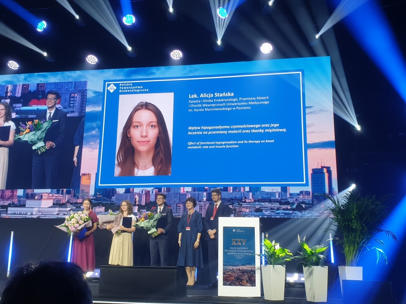Nagrodę I stopnia otrzymała lek. Alicja Stańska z Katedry i Kliniki Endokrynologii, Przemiany Materii i Chorób Wewnętrznych kierowanej przez Pana prof. dr. hab. n. med. Marka Ruchałę za projekt pt. „Wpływ hipogonadyzmu czynnościowego oraz jego leczenia na przemianę materii oraz tkankę mięśniową” - promotor i opiekun naukowy prof. dr. hab. n. med. Nadia Sawicka-Gutaj.