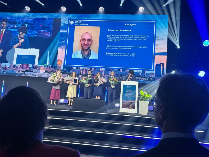 W konkursie na najlepszą publikację naukową z dziedziny diabetologii i chorób metabolicznych w 2023 r. im. Kazimierza Funka, II nagrodę za pracę „Effects of maternal type 1 diabetes and confounding factors on neonatal microbiomes” autorstwa Marzena Gajęcka, Paweł Gutaj, Katarzyna Jaśkiewicz, Małgorzata Rydzanicz, Tomasz Szczapa, Dorota Kamińska, Grzegorz Kosewski, Juliusz Przysławski, Rafał Ploski, Ewa Wender- Ożegowska otrzymał dr hab. n med. Paweł Gutaj z Kliniki Rozrodczości kierowanej przez Panią Prof. dr hab. n. med. Ewę Wender-Ożegowską. Warto zaznaczyć, że praca została opublikowana w czasopiśmie DIABETOLOGIA, jednym z dwóch najlepszych na świecie czasopism naukowych w dziedzinie diabetologii.