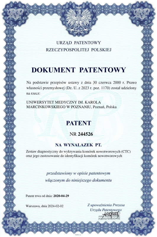 Patent na wynalazek pt. Zestaw diagnostyczny do wykrywania komórek (CTC) oraz jego zastosowanie do identyfikacji komórek nowotworowych