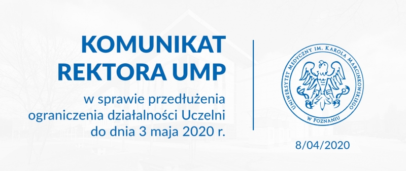 W trosce o nasze bezpieczeństwo, a przede wszystkim zdrowie całej społeczności Uniwersytetu Medycznego im. Karola Marcinkowskiego w Poznaniu, podjąłem decyzję o przedłużeniu ograniczenia działalności Uczelni do dnia 3 maja br. Podpisałem dziś zarządzenie w tej sprawie. Najpewniej w najbliższych dniach pojawią się stosowne rekomendacje Władz Państwa. Chciałbym jednak, byśmy w możliwie największym komforcie mogli zorganizować kolejne tygodnie pracy.