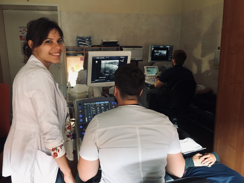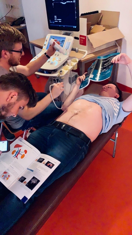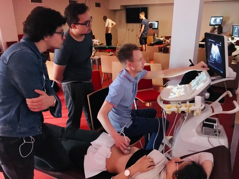 Uczestnicy mieli również okazję poznać nasze piękne miasto podczas spaceru z przewodnikiem. Okazało się jednak, że najlepszym sposobem na spędzenie wolnego czasu jest… więcej praktyki. Na szczęście była taka możliwość, ponieważ sala telewizyjna w DS “Karolek” na cały tydzień przemieniła się w profesjonalną pracownię ultrasonograficzną, z której studenci mogli korzystać do woli. Dzięki wsparciu firmy MIRO oraz Zuzanny Janowicz, sala została wyposażona w pięć różnych, nowoczesnych aparatów z kompletem głowic, a także jedną przenośną głowicę Lumify z aplikacją mobilną podłączoną bezpośrednio do tabletu.
