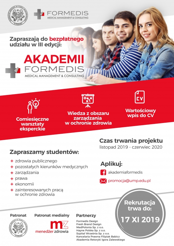 Biuro Karier UMP oraz FORMEDIS Medical Management & Consulting zapraszają do udziału w III edycji Akademii Formedis. Projekt obejmuje 8 warsztatów, prowadzonych przez ekspertów rynku o tematyce m.in.: zarządzania w ochronie zdrowia, marketingu, prawa medycznego, komunikacji oraz finansów. W praktyczny sposób, poprzez ćwiczenia oraz dyskusje z wykładowcami przygotowuje uczestników do przyszłej pracy zawodowej. W projekcie wziąć udział mogą studenci wszystkich kierunków medycznych, a także absolwenci do 30 r.ż. zainteresowani pracą w obszarze zarządzania w ochronie zdrowia.