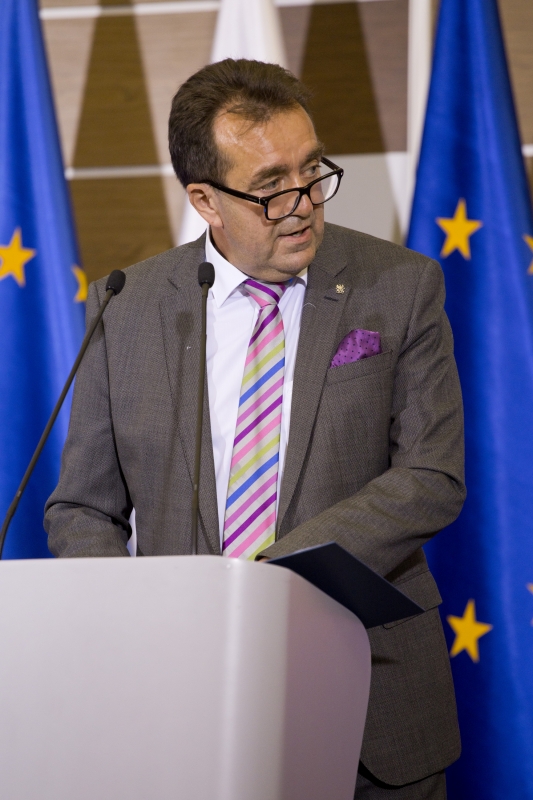 Rektor stoi przy mównicy. Pozostali goście siedzą przy niskich stolikach