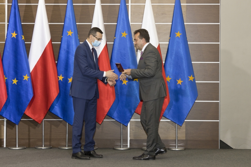 Mateusz Morawiecki odbiera Medal od Andrzeja Tykarskiego