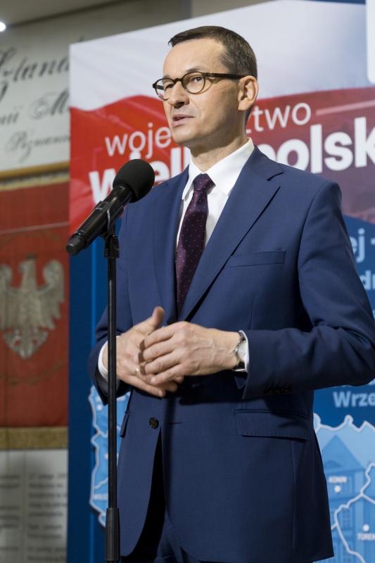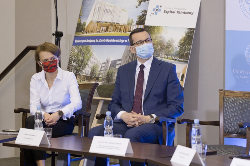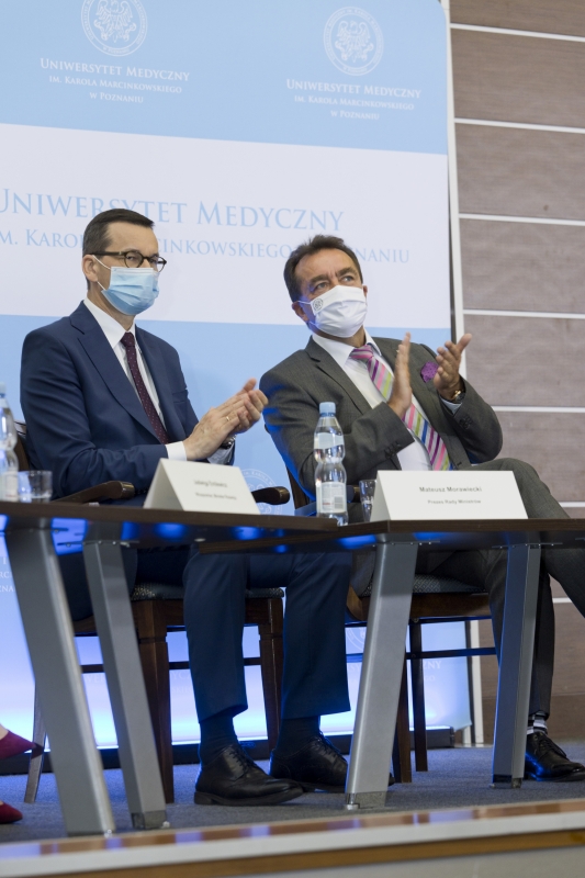 Premier Mateusz Morawiecki i Rektor Andrzej Tykarski siedzą za stołem