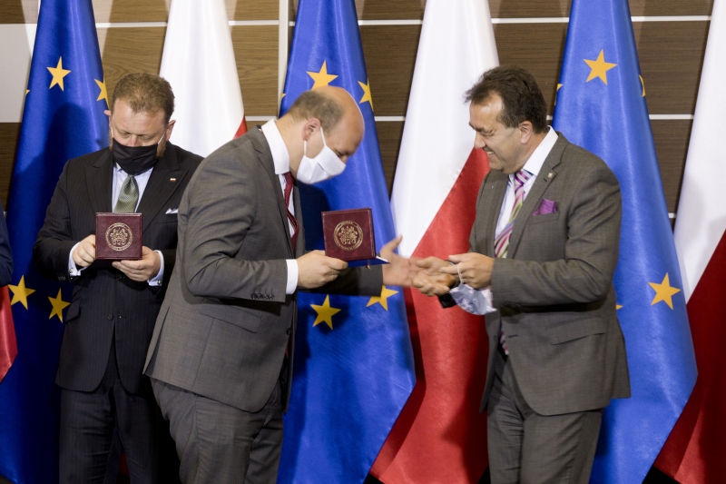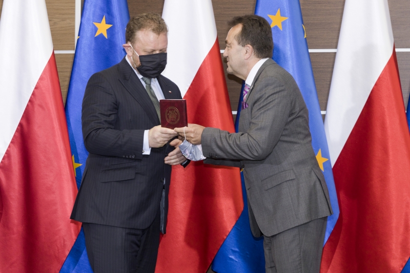Łukasz Szumowski odbiera Medal od Andrzeja Tykarskiego