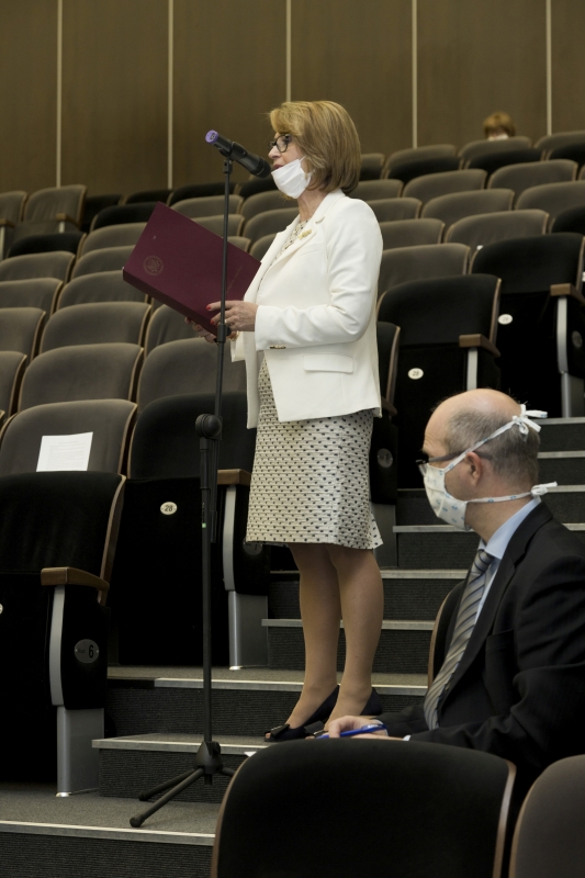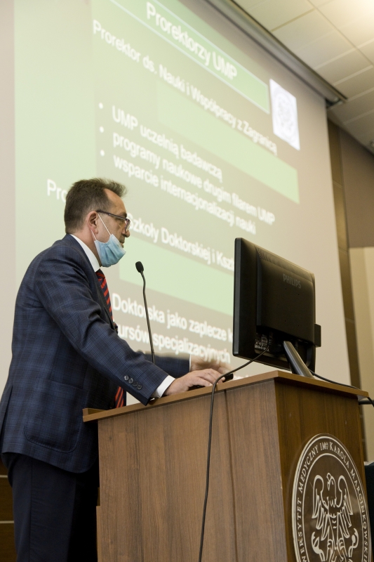 Rektor stoi przy mównicy i wygłasza przemówienie