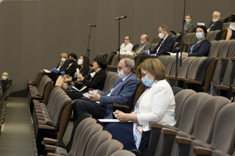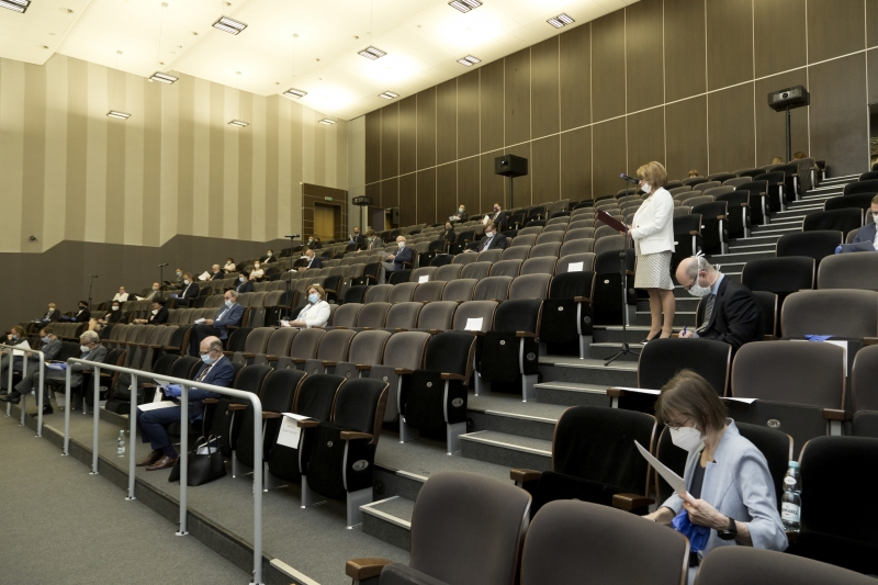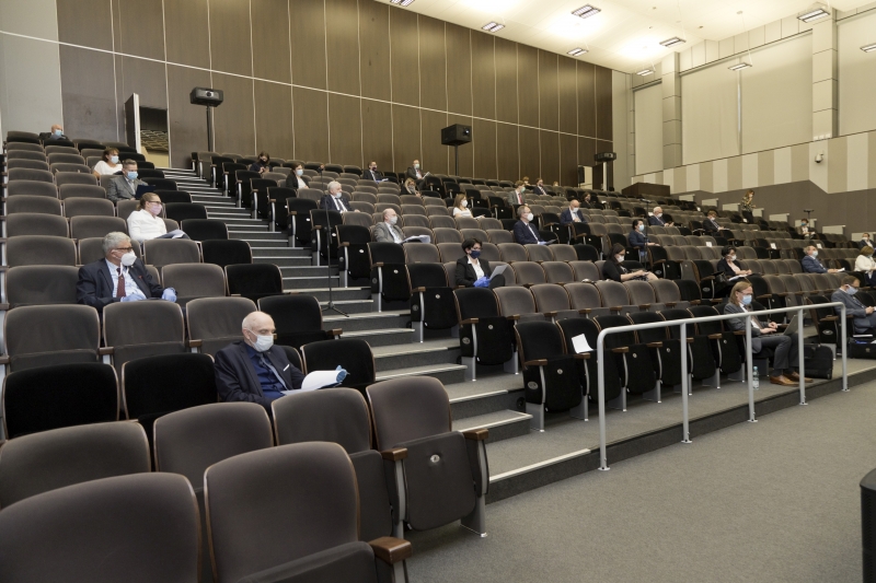 Senatorowie siedzą na widowni w sali A Centrum Kongresowo-Dydaktycznego