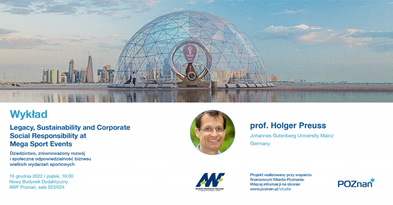 Akademia Wychowania Fizycznego im. Eugeniusza Piaseckiego w Poznaniu zaprasza do udziału w wykładzie otwartym prof. Holgera Preussa pt. „Legacy, Sustainability and Corporate Social Responsibility at Mega Sport Events” („Dziedzictwo, zrównoważony rozwój i społeczna odpowiedzialność biznesu wielkich wydarzeń sportowych”). Spotkanie zorganizowane w ramach projektu Akademicki Poznań odbędzie się w piątek 16 grudnia 2022 r.