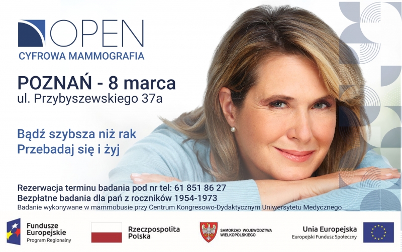 Serdecznie zapraszamy wszystkie Panie z roczników 1954-1973 na bezpłatne profilaktyczne badania mammograficzne, które będą prowadzone 8 marca 2023 r. w mammobusie przy Centrum Kongresowo-Dydaktycznym Uniwersytetu Medycznego im. Karola Marcinkowskiego w Poznaniu.