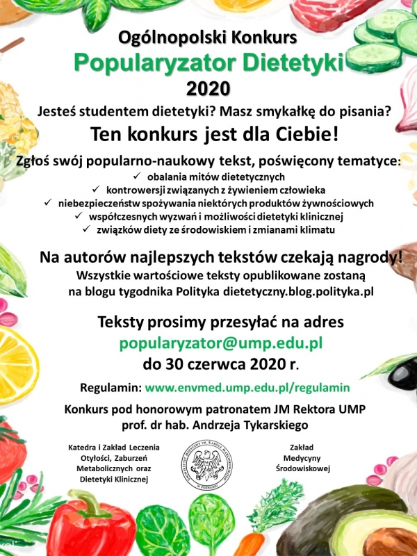 Katedra i Zakład Leczenia Otyłości, Zaburzeń Metabolicznych oraz Dietetyki Klinicznej wraz z Zakładem Medycyny Środowiskowej UM w Poznaniu ogłaszają Ogólnopolski Konkurs „Popularyzator Dietetyki 2020” pod honorowym patronatem JM Rektora prof. dra hab. Andrzeja Tykarskiego.
