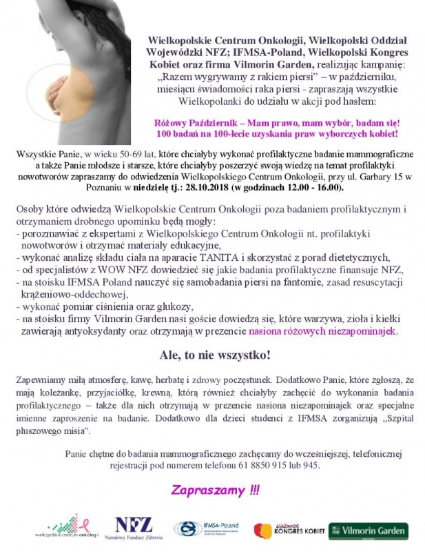 W październiku - miesiącu świadomości raka piersi, Wielkopolskie Centrum Onkologii realizuje kampanię edukacyjną, której jednym z elementów są akcje edukacyjne połączone z badaniami profilaktycznymi.