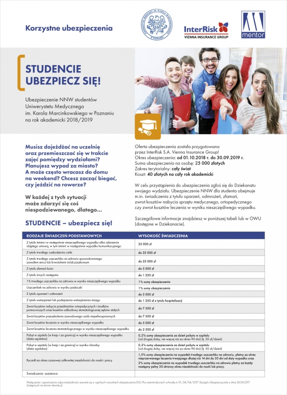 W roku akademickim 2018/2019 indywidualna składka na ubezpieczenie od następstw nieszczęśliwych wypadków (NNW) studentów wynosi 40 zł.