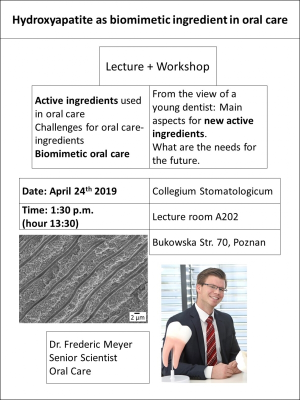 Zakład Stomatologii Zintegrowanej Uniwersytetu Medycznego im. Karola Marcinkowskiego w Poznaniu zaprasza na otwarty wykład dra Frederica Meyera pt.: „Hydroxyapatite as biomimetic ingredient in oral care” na temat aktualnych wyników badań i stanu wiedzy dotyczących nowych, wapniowo-fosforanowych, środków remineralizujących szkliwo zębów, które mogą być cenną wskazówką dla studentów stomatologii, higieny dentystycznej, a zwłaszcza lekarzy dentystów.