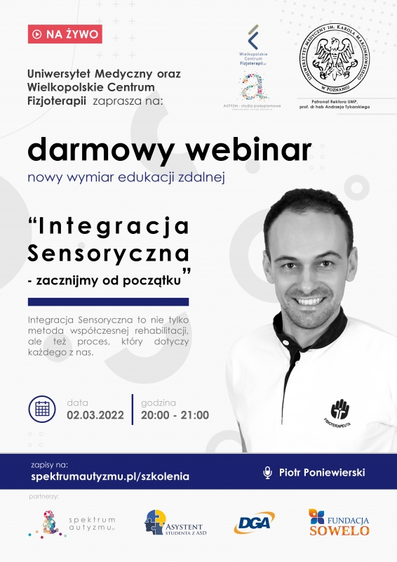Data wydarzenia: 2 marca 2022Uniwersytet Medyczny im. Karola Marcinkowskiego w Poznaniu oraz Wielkopolskie Centrum Fizjoterapii zapraszają na darmowy webinar "Integracja Sensoryczna - zacznij od początku".