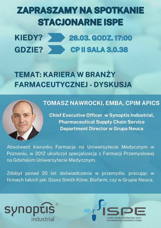 Data wydarzenia: 26 marca 2024Serdecznie zapraszamy na kolejne spotkanie Studenckiego Oddziału ISPE organizowane wspólnie z Katedrą i Zakładem Technologii Postaci Leku.