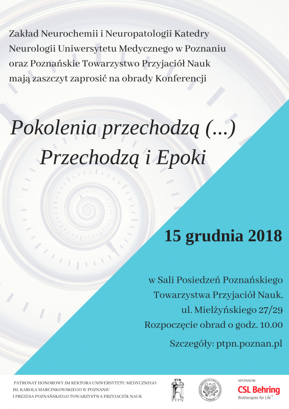 Data wydarzenia: 15 grudnia 2018Dnia 15 grudnia 2018 r. organizowana jest konferencja "Pokolenia przechodzą (...) Przechodzą i Epoki", która odbędzie się w Poznańskim Towarzystwie Przyjaciół Nauk.