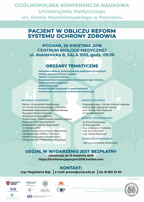 Katedra Prawa Medycznego, Organizacji i Zarządzania w Opiece Zdrowotnej, Zakład Prawa Medycznego i Zakład Organizacji i Zarządzania w Opiece Zdrowotnej Uniwersytetu Medycznego im. Karola Marcinkowskiego w Poznaniu mają zaszczyt zaprosić na ogólnopolską konferencję naukową. Celem wydarzenia jest integracja środowisk naukowych, zajmujących się zagadnieniami prawa medycznego oraz problemami zarządzania w opiece zdrowotnej.