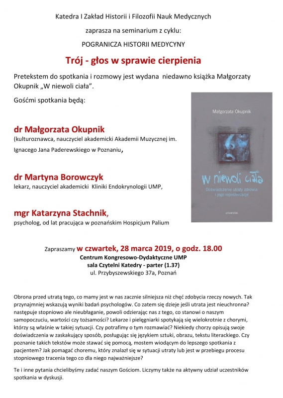 Zapraszamy w czwartek 28 marca o godz. 18.00 do Centrum Kongresowo-Dydaktycznego UMP, sala Czytelni Katedry i Zakładu Historii i Filozofofii Nauk Medycznych, parter (1.37).