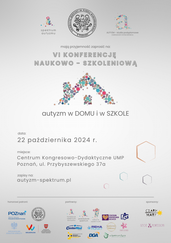 Data wydarzenia: 22 października 2024Uniwersytet Medyczny im. Karola Marcinkowskiego w Poznaniu oraz Centrum Edukacyjno - Terapeutyczne Spektrum Autyzmu po raz szósty zapraszają na konferencję „Autyzm w domu i szkole”, w której wezmą udział specjaliści, rodzice oraz wszystkie osoby z całej Polski zainteresowane tematem spektrum autyzmu.