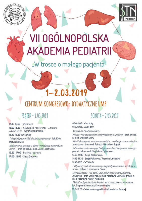 Konferencja ta adresowana jest do studentów kierunków medycznych oraz młodych lekarzy. Podczas tegorocznej edycji pragniemy zaprezentować najnowszą wiedzę z zakresu diagnostyki, leczenia i profilaktyki częstych dolegliwości wieku dziecięcego, którą powinien posiadać każdy absolwent kierunku medycznego. Naszym celem jest również poszerzanie umiejętności praktycznego wykorzystywania wiedzy przez uczestników poprzez organizację licznych warsztatów między innymi w Centrum Symulacji Medycznej, jak i z biopsji szpiku, laparoskopii, resuscytacji noworodka, punkcji lędźwiowej oraz interpretacji badań laboratoryjnych. Nasza Konferencja obejmuje także Sesję Quizową, w trakcie której chcemy nagrodzić uczestników wykazujących się największą wiedzą z zakresu Pediatrii. Organizujemy również Sesję Konkursową oraz Sesję Plakatową z zakresu Onkologii i Hematologii Dziecięcej, podczas której studenci oraz lekarze stażyści będą mieli możliwość zaprezentowania swoich prac oryginalnych oraz opisów przypadków.