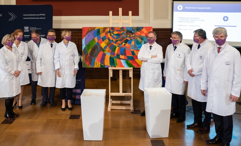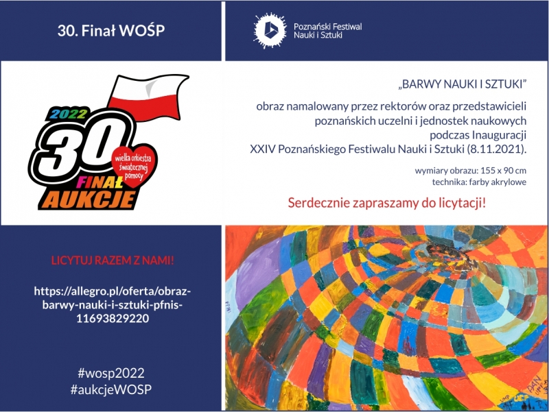 obraz „BARWY NAUKI I SZTUKI” namalowany przez rektorów oraz przedstawicieli poznańskich uczelni i jednostek naukowych podczas Inauguracji XXIV Poznańskiego Festiwalu Nauki i Sztuki (8.11.2021) jest przedmiotem aukcji podczas 30. Finału WOŚP, organizowanego przez Fundację Wielkiej Orkiestry Świątecznej Pomocy.