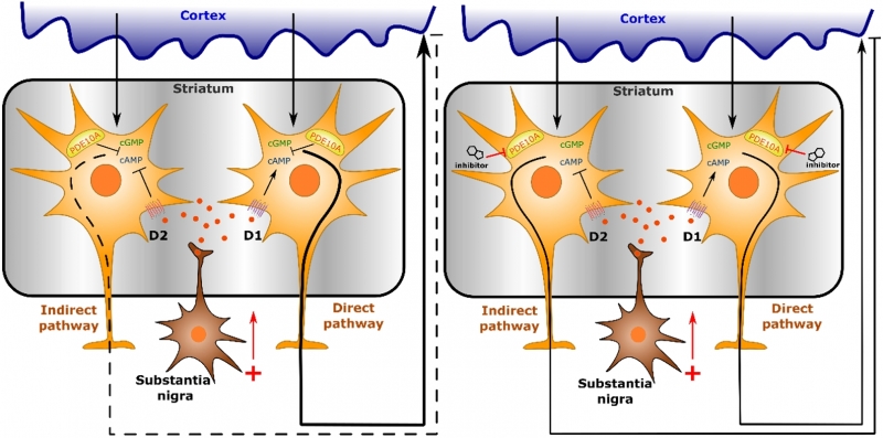Ryc. 1. Mechanizm działania PDE10A wynikający z równoważenia transmisji drogi pośredniej i bezpośredniej z prążkowia do kory mózgowej (za zgodą dra Mikołaja Matłoki).