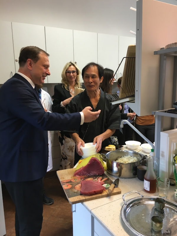 Nasz Szacowny Gość oprócz prezentacji historii kontaktów pomiędzy naszymi państwami, przygotował także kulinarny pokaz przyrządzania japońskich potraw - Oyakodonburi oraz Sushi.