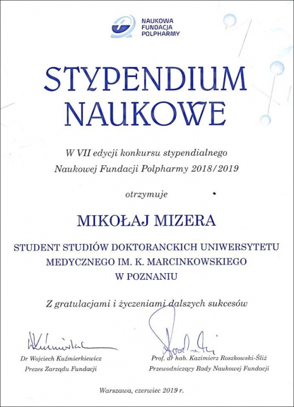 Dnia 12 czerwca w Warszawie odbyła się Gala Naukowej Fundacji Polfarmy. Pośród 10 laureatów na najlepszą pracę doktorską i stypendium naukowe Fundacji znalazł się mgr inż. Mikołaj Mizera, który realizuje pracę pt. „Zastosowanie uczenia maszynowego w modelowaniu zależności struktura-właściwość fizykochemiczna (QSPR) dla wybranych aktywnych substancji farmaceutycznych” w Katedrze i Zakładzie Farmakognozji pod opieką dr hab. Judyty Cielecka-Piontek. Promotorem pomocniczym jest dr Dorota Latek z Pracowni Modelowania Molekularnego na Wydziale Chemii Uniwersytetu Warszawskiego.