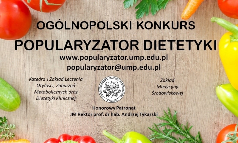 Katedra i Zakład Leczenia Otyłości, Zaburzeń Metabolicznych oraz Dietetyki Klinicznej wraz z Zakładem Medycyny Środowiskowej Uniwersytetu Medycznego im. Karola Marcinkowskiego w Poznaniu ogłaszają drugą edycję Ogólnopolskiego Konkursu "Popularyzator Dietetyki 2021". Konkurs jest adresowany do wszystkich aktywnych studentów dietetyki studiujących na dowolnej uczelni wyższej w Polsce. Patronat honorowy nad konkursem objął Rektor UMP prof. dr hab. Andrzej Tykarski.