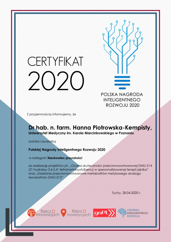- Dr hab. Hanna Piotrowska-Kempisty za realizację projektów pt. „Ocena skuteczności przeciwnowotworowej DMU-214 (3’-hydroksy-3,4.5,4’-tetrametoksystylbenu) w spersonalizowanej terapii jajnika” oraz „Działanie przeciwnowotworowe metabolitów metylowego analogu resweratrolu DMU-212”.