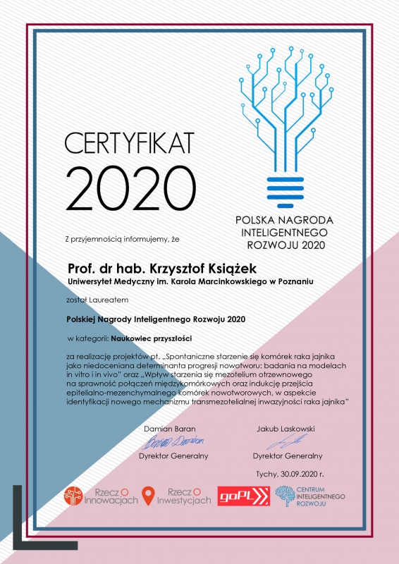 - Prof. dr hab. Krzysztof Książek za realizację projektów pt. „Spontaniczne starzenie się komórek raka jajnika jako niedoceniana determinanta progresji nowotworu: badania na modelach in vitro i in vivo” oraz „Wpływ starzenia się mezotelium otrzewnowego na sprawność połączeń międzykomórkowych oraz indukcję przejścia epitelialno-mezenchymalnego komórek nowotworowych, w aspekcie identyfikacji nowego mechanizmu transmezotelialnej inwazyjności raka jajnika”.