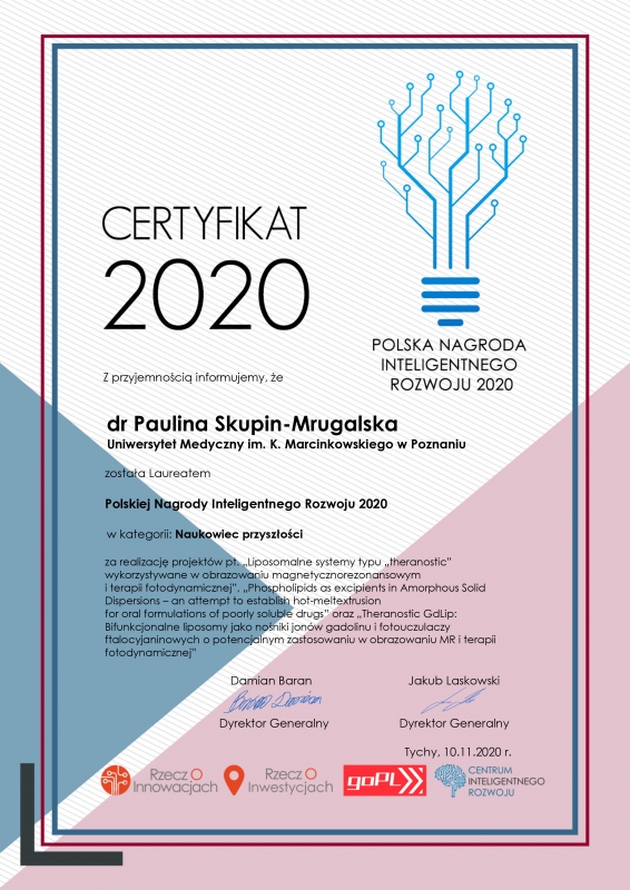 - Dr Paulina Skupin-Mrugalska za realizację projektów pt. „Liposomalne systemy typu „theranostic” wykorzystywane w obrazowaniu magnetycznorezonansowymi terapii fotodynamicznej”, „Phospholipids as excipients in Amorphous Solid Dispersions - an attempt to establish hot-meltextrusion for oral formulations of poorly soluble drugs” oraz „Theranostic GdLip: Bifunkcjonalne liposomy jako nośniki jonów gadolinu i fotouczulaczy ftalocyjaninowych o potencjalnym zastosowaniu w obrazowaniu MR i terapii fotodynamicznej”.