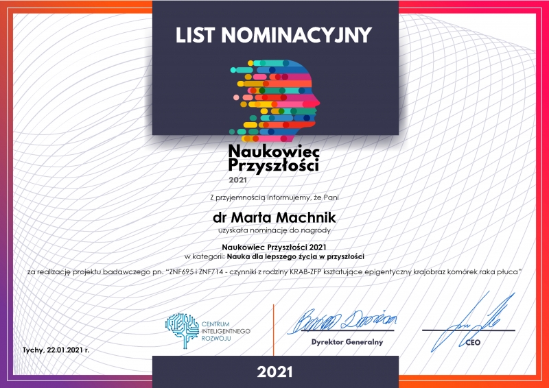 Dr Marta Machnik z Zakładu Immunologii Nowotworów otrzymała nominację za realizację projektu badawczego pn. "ZNF695 i ZNF714 - czynniki z rodziny KRAB-ZFP kształtujące epigentyczny krajobraz komórek raka płuca".
