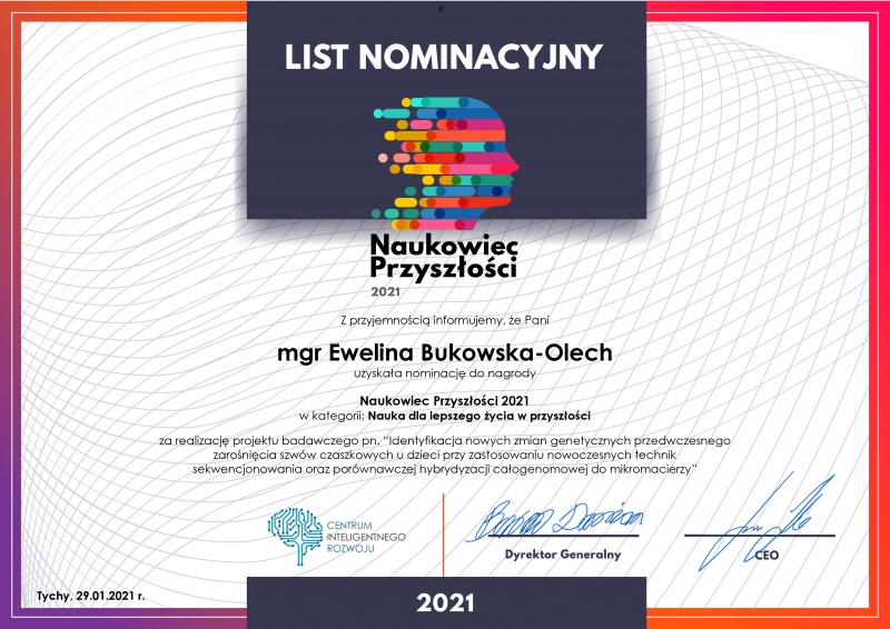 Mgr Ewelina Bukowska-Olech z Katedry i Zakładu Genetyki Medycznej otrzymała nominację za realizację projektu badawczego pn. "Identyfikacja nowych zmian genetycznych przedwczesnego zarośnięcia szwów czaszkowych u dzieci przy zastosowaniu nowoczesnych technik sekwencjonowania oraz porównawczej hybrydyzacji całogenomowej do mikromacierzy".