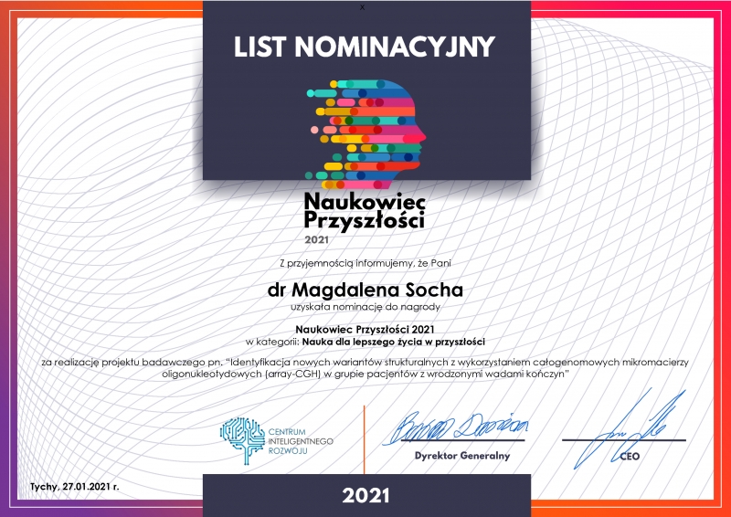 - Dr Magdalena Socha z Katedry i Zakładu Genetyki Medycznej otrzymała nominację za realizację projektu badawczego pn. "Identyfikacja nowych wariantów strukturalnych z wykorzystaniem całogenomowych mikromacierzy oligonukleotydowych (array-CGH) w grupie pacjentów z wrodzonymi wadami kończyn".