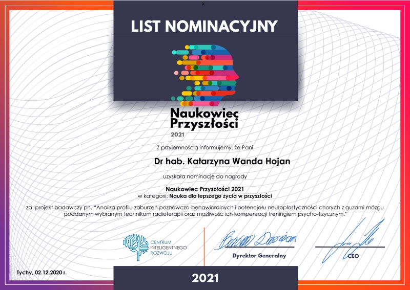 - Dr hab. Katarzyna Hojan z Zakładu Terapii Zajęciowej otrzymała nominację za projekt badawczy pn. "Analiza profilu zaburzeń poznawczo-behawioralnych i potencjału neuroplastyczności chorych z guzami mózgu poddanym wybranym technikom radioterapii oraz możliwość ich kompensacji treningiem psycho-fizycznym".