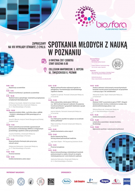 Dnia 8 kwietnia 2017 r. (sobota) już po raz ósmy odbędą się Wykłady Otwarte z cyklu "Spotkania Młodych z Nauką w Poznaniu" organizowane przez Studenckie Koło Naukowego "Biosfera" przy Katedrze i Zakładzie Chemii Klinicznej i Diagnostyki Molekularnej UMP.