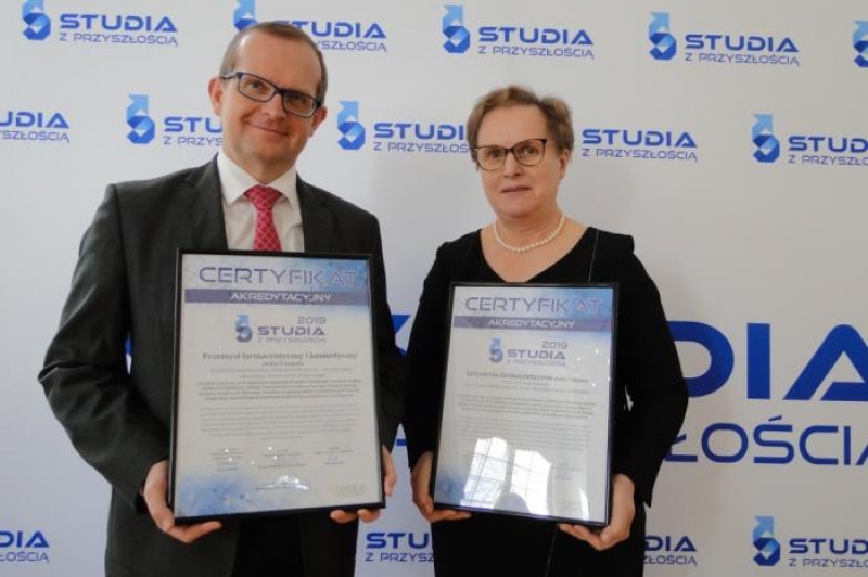 Prof. dr hab. Michał Markuszewski, dziekan Wydziału Farmaceutycznego z Oddziałem Medycyny Laboratoryjnej Gdańskiego Uniwersytetu Medycznego z certyfikatem akredytacyjnym „Studia z przyszłością” dla kierunku Przemysł farmaceutyczny i kosmetyczny, studia II stopnia stacjonarne oraz prof. dr hab. Anna Jelińska z certyfikatem akredytacyjnym „Studia z przyszłością” dla kierunku Inżynieria farmaceutyczna, studia I stopnia stacjonarne.