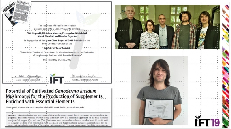 Wyróżnienie to przyznawane jest przez amerykański Instytut Technologów Żywności (Institute of Food Technologists; IFT) autorom najlepiej cytowanych prac badawczych, publikowanych na łamach czasopisma naukowego Journal of Food Science. Nagrodzona praca "Potential of cultivated Ganoderma lucidum mushrooms for the production of supplements enriched with essential elements" opisuje metodę hodowli lakownicy żółtawej na zmodyfikowanych podłożach prowadzącą do otrzymania produktów spożywczych wzbogaconych w selen, cynk i miedź. Nagrodę wręczono podczas dziewiętnastego międzynarodowego zjazdu IFT, który odbył się w dniach 2-5 czerwca br. w Nowym Orleanie.