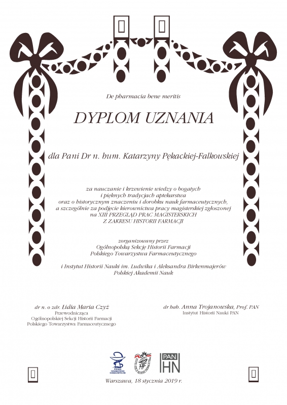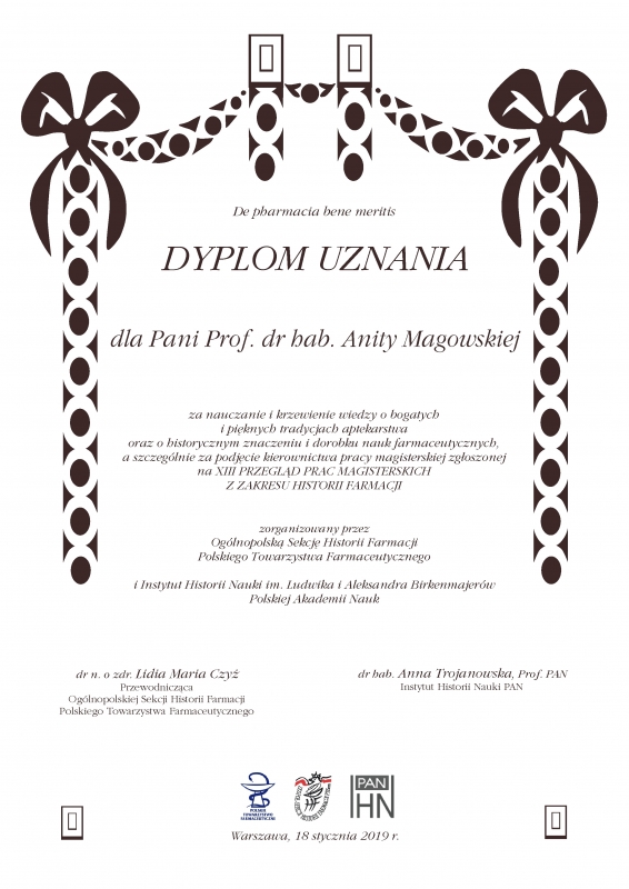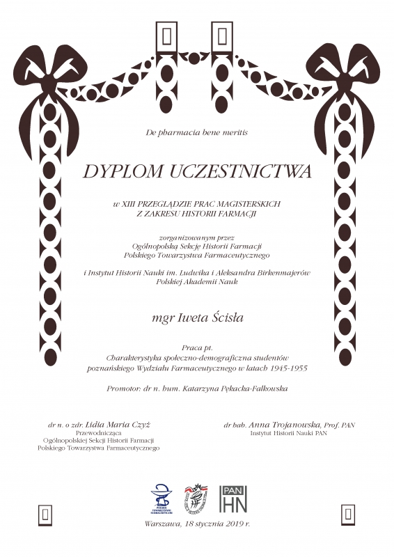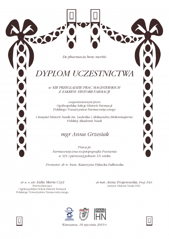 Uprzejmie informujemy, że 18 stycznia 2019 r. odbyła się trzynasta edycja corocznego Przeglądu Prac Magisterskich z Zakresu Historii Farmacji organizowanego przez Sekcję Historyczną Polskiego Towarzystwa Farmaceutycznego oraz Sekcję Historii Chemii i Farmacji Instytutu Historii Nauki im. Ludwika i Aleksandra Birkenmajerów Polskiej Akademii Nauk.