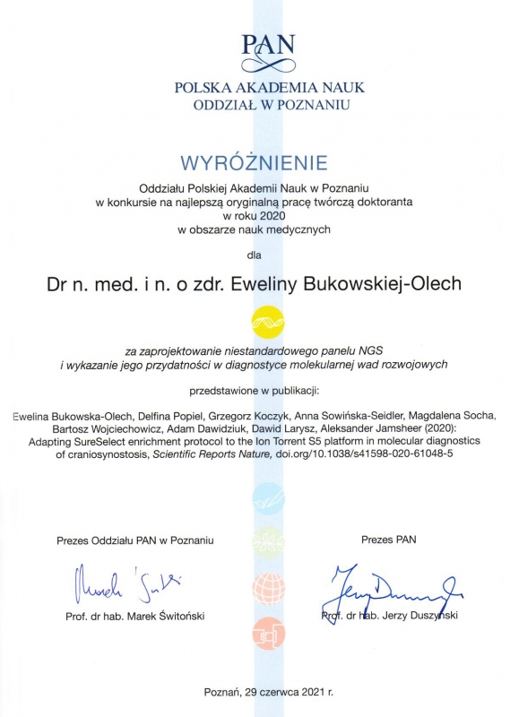Wyróżnienie przyznane zostało za zaprojektowanie niestandardowego panelu NGS i wykazanie jego przydatności w diagnostyce molekularnej wad rozwojowych, przedstawione w pracy: